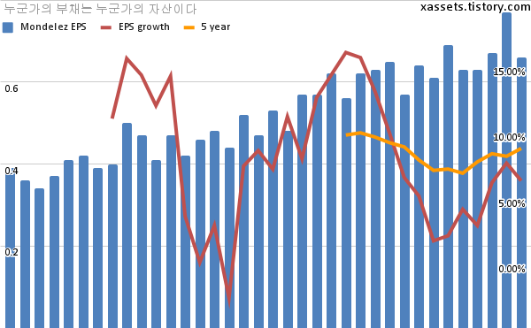 - 포스팅일 기준, 몬델리즈의 1, 5년 연평균 EPS 성장률은 6.23%, 8.69%이다.