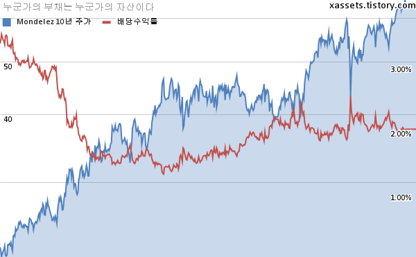 몬델리즈 배당수익률 및 주가 차트 (2011년~2021년)