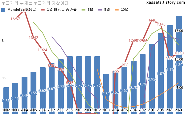 몬델리즈 배당금 및 배당성장률 차트 (2002년~2021년)