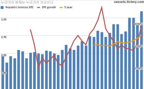 - 포스팅일 기준, 리퍼블릭 서비스의 1, 5년 연평균 EPS 성장률은 18.24%, 14.31%이다.