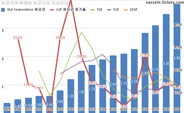 KLA 배당금 및 배당성장률 차트 (2005년~2021년)