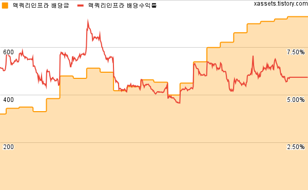 - 지난 반기 기준 차트는 지난 맥쿼리인프라 주가, 배당금, 배당수익률 차트 목록에서 볼 수 있다.