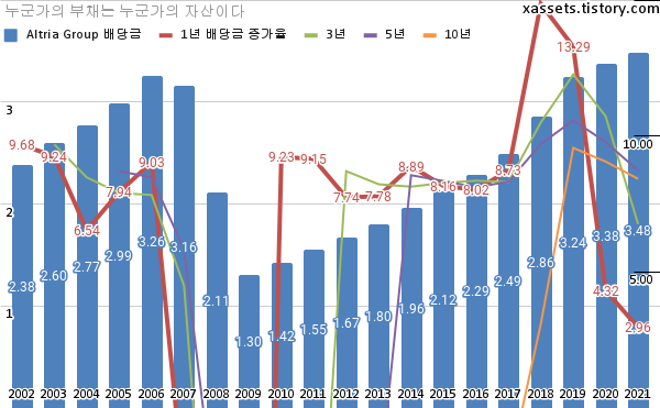- 알트리아 그룹의 2021년 기준 1, 3, 5, 10년 연평균 배당성장률은 2.96%, 6.76%, 8.73%, 8.42%이다.