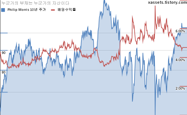 필립모리스 배당수익률 및 주가 차트 (2011년~2021년)