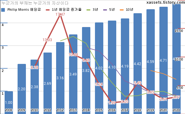 - 필립모리스의 2021년 기준 1, 3, 5, 10년 연평균 배당성장률은 2.97%, 3.14%, 3.42%, 6.07%이다.