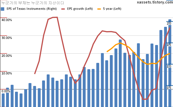 - 포스팅일 기준, 텍사스 인스트루먼트의 1, 5년 연평균 EPS 성장률은 34.52%, 20.01%이다.