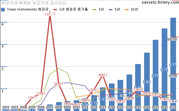 텍사스 인스트루먼트 배당금 및 배당성장률 차트 (2002년~2021년)