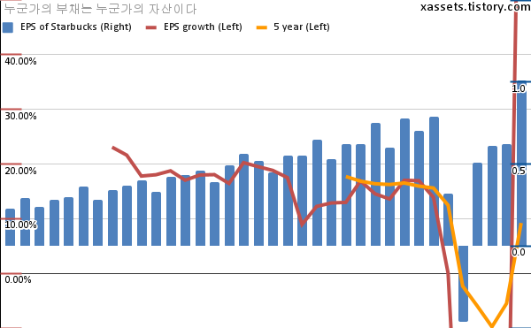 - 포스팅일 기준, 스타벅스의 1, 5년 연평균 EPS 성장률은 103.70%, 9.21%이다.