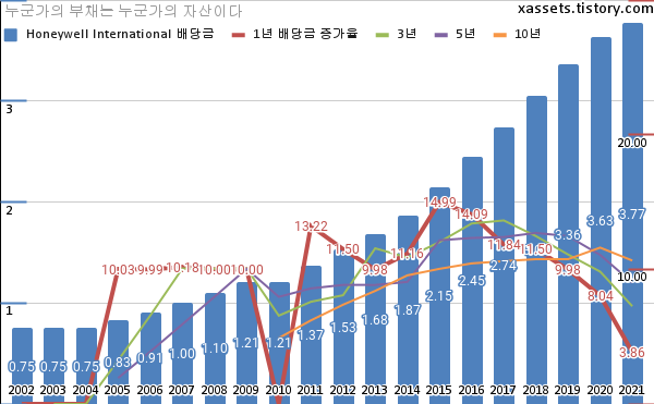 허니웰 인터내셔널 배당금 및 배당성장률 차트 (2002년~2021년)
