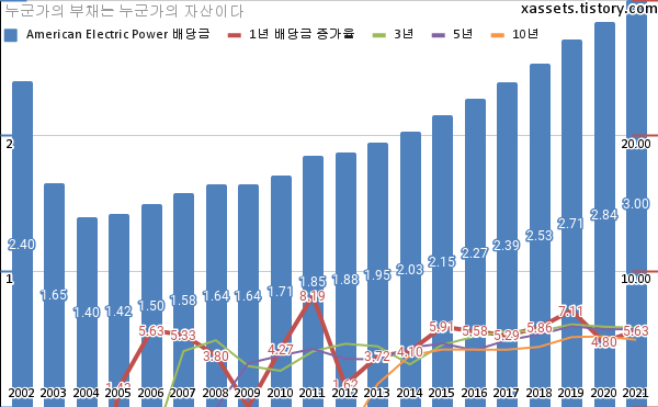 - 아메리칸 일렉트릭 파워의 2021년 기준 1, 3, 5, 10년 연평균 배당성장률은 5.63%, 5.84%, 5.74%, 4.95%이다.