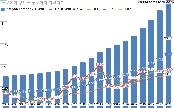 스테판 컴퍼니 배당금 및 배당성장률 차트 (2002년~2021년)