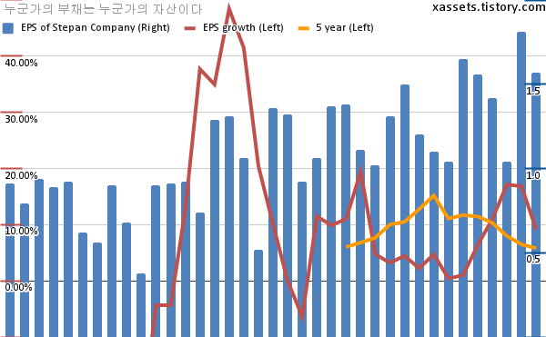 - 포스팅일 기준, 스테판 컴퍼니의 1, 5년 연평균 EPS 성장률은 9.16%, 5.83%이다.