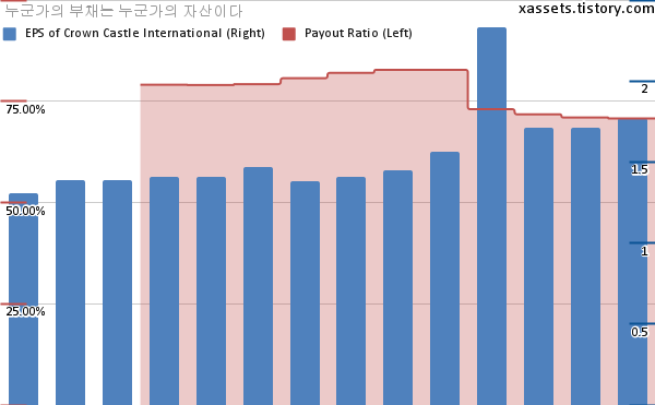 크라운캐슬 인터내셔널 배당금 및 배당성장률 차트 (2014년~2021년)