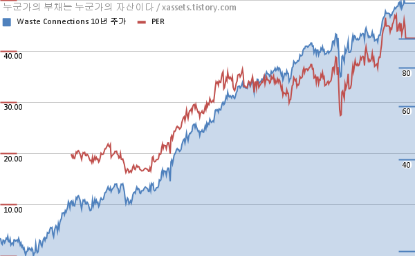 - 포스팅일 기준, 웨이스트 커넥션스의 1, 3, 5, 10년 연평균 주가상승률은 26.43%, 21.46%, 21.18%, 19.48%이다.
