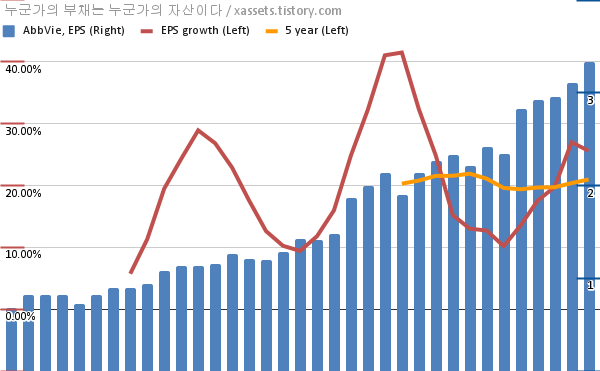 - 포스팅일 기준, 애브비의 1, 5년 연평균 EPS 성장률은 25.61%, 20.98%이다.