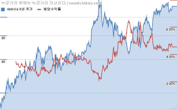 애브비 배당수익률 및 주가 상승률 차트 (2012년~2021년)