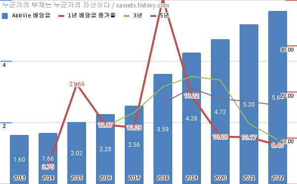 - 애브비의 2022년 기준 1, 3, 5년 연평균 배당성장률은 8.46%, 9.63%, 17.11%이다.