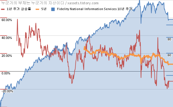 피델리티 인포메이션 서비스 Fidelity National Information Services라는 티커가 NYSE:FIS인 기업이 있다. 이름에서 알 수 있듯이 피델리티 산하의 기업이며, 금융정보를 서비스 하는 기업이다. 그런데 최근에 주가가 이유없이(이유야 있겠지만, 일반적으로 많이 보는 뉴스 사이트에서는 별다른 내용이 나오지 않는다) 많이 하락했다.