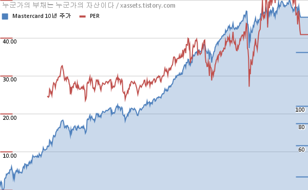 - 마스터카드의 PER이 낮아지기는 했지만 아직도 상당히 높은 수준이다.