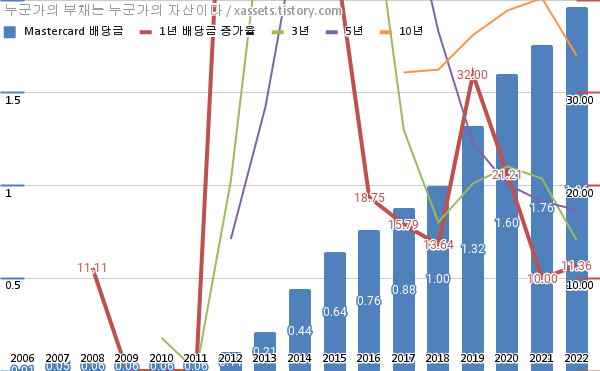 마스터카드 배당금 및 배당성장률 차트 (2006년~2022년)
