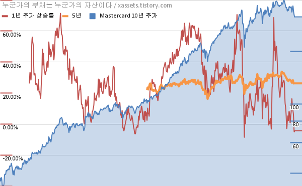- 포스팅일 기준, 마스터카드의 1, 3, 5, 10년 연평균 주가상승률은 -6.20%, 18.02%, 25.34%, 24.46%이다.