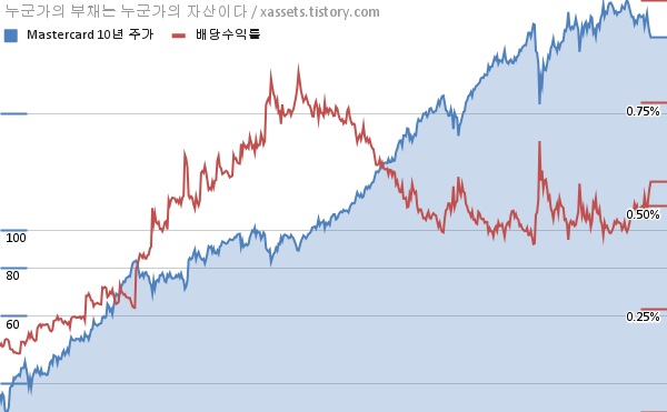 마스터카드 배당수익률 및 주가 상승률 차트 (2011년~2021년)