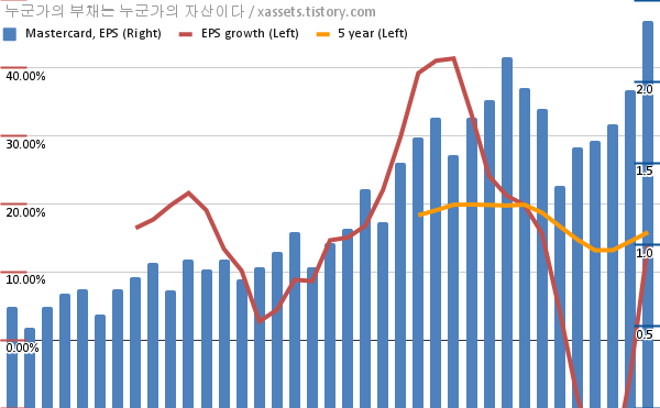 - 포스팅일 기준, 마스터카드의 1, 5년 연평균 EPS 성장률은 27.40%, 17.88%이다.