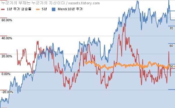 - 포스팅일 기준, 머크(MSD)의 1, 3, 5, 10년 연평균 주가상승률은 -4.72%, 0.58%, 4.98%, 7.97%이다.