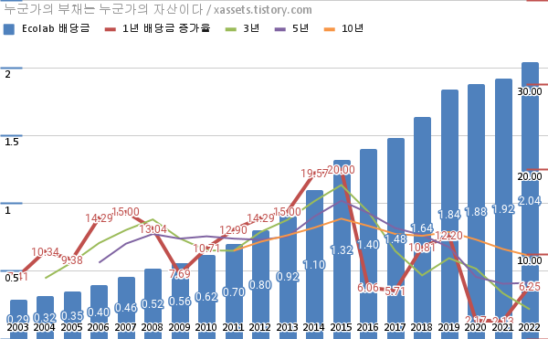 에코랩 배당금 및 배당성장률 차트 (2003년~2022년)