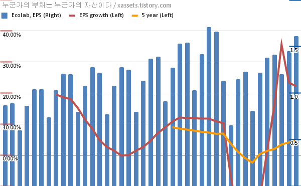 - 포스팅일 기준, 에코랩의 1, 5년 연평균 EPS 성장률은 22.20%, 4.50%이다.