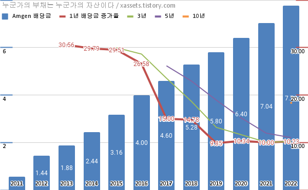 - 암젠의 2022년 기준 1, 3, 5, 10년 연평균 배당성장률은 10.23%, 10.19%, 11.02%, 18.35%이다.