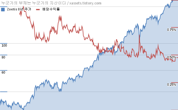 조에티스 배당수익률 및 주가 상승률 차트 (2013년~2021년)