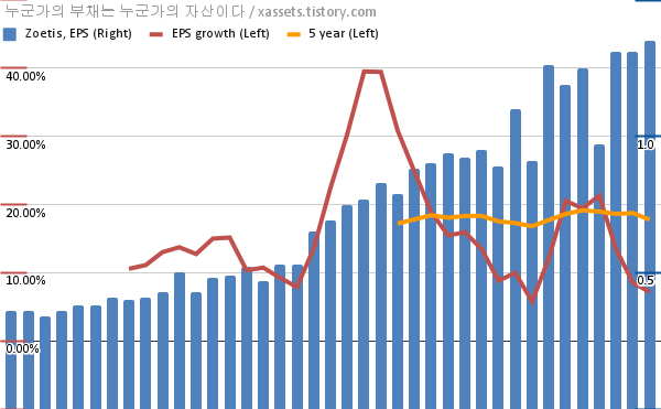 - 포스팅일 기준, 조에티스의 1, 5년 연평균 EPS 성장률은 7.16%, 17.78%이다.