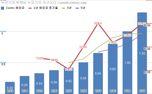 - 조에티스의 2022년 기준 1, 3, 5년 연평균 배당성장률은 30.00%, 25.61%, 25.35%이다.