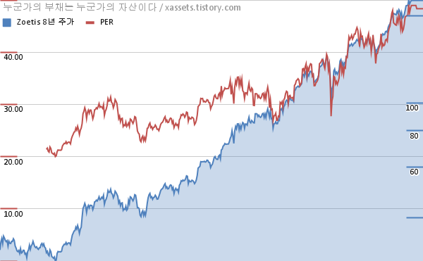 - 조에티스의 PER은 매우 높은 수준이다. 물론 높은 성장과 낮은 변동성이 반영돼서 그렇다.