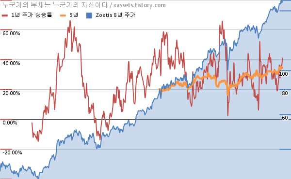 - 포스팅일 기준, 조에티스의 1, 3, 5년 연평균 주가상승률은 41.39%, 36.36%, 35.39%이다.