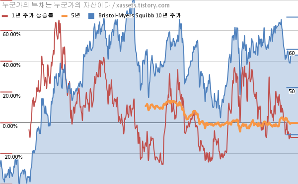 - 포스팅일 기준, 브리스톨-마이어스 스퀴브의 1, 3, 5, 10년 연평균 주가상승률은 -7.18%, 2.64%, -0.78%, 4.85%이다.