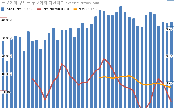 - 포스팅일 기준, AT&T의 1, 5년 연평균 EPS 성장률은 -6.53%, 1.46%이다.