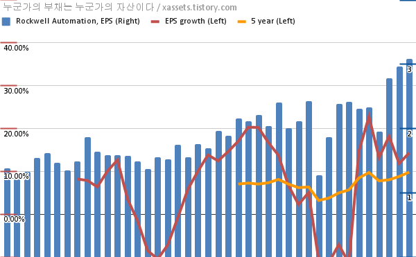 - 포스팅일 기준, 로크웰 오토메이션의 1, 5년 연평균 EPS 성장률은 22.79%, 9.72%이다.