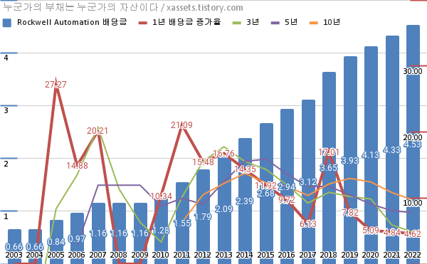 - 로크웰 오토메이션의 2021년 기준 1, 3, 5, 10년 연평균 배당성장률은 4.84%, 5.91%, 8.09%, 10.82%이다.