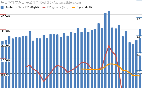 - 포스팅일 기준, 킴벌리 클라크의 1, 5년 연평균 EPS 성장률은 -15.20%, -1.80%이다.