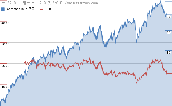 - 포스팅일 기준, 컴캐스트의 1, 3, 5, 10년 연평균 주가상승률은 0.30%, 10.56%, 5.73%, 13.85%이다.