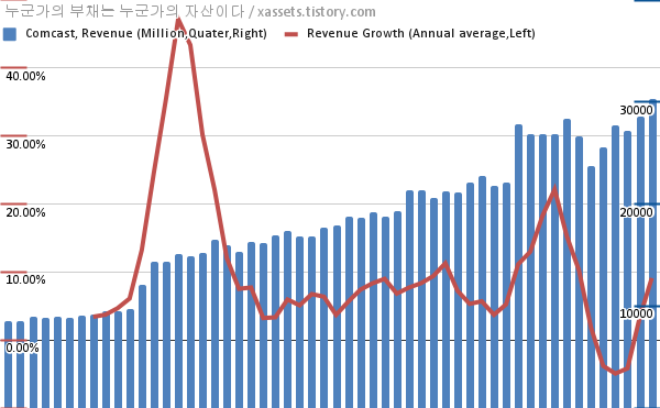 컴캐스트 매출 및 매출성장률 차트 (2008년~2021년)