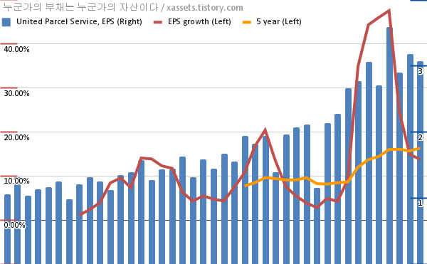 - 포스팅일 기준, UPS의 1, 5년 연평균 EPS 성장률은 13.75%, 16.33%이다.
