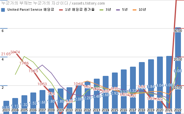 UPS 배당금 및 배당성장률 차트 (2003년~2022년)