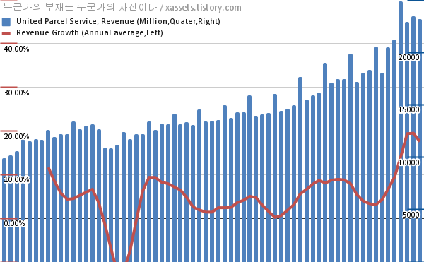 UPS 매출 및 매출 성장률 차트 (2005년~2021년)