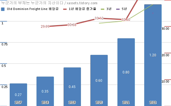 - 올드 도미니언의 2022년 기준 1, 3, 5년 연평균 배당성장률은 50.00%, 38.35%, 35.08%이다.