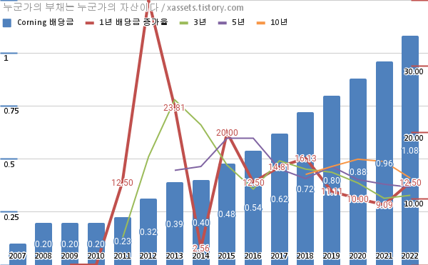 코닝 배당금 및 배당성장률 차트 (2007년~2022년)