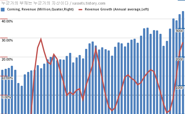 코닝 매출 및 매출 성장률 차트 (2007년~2021년)