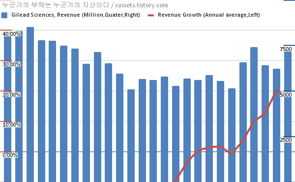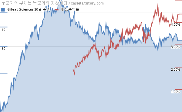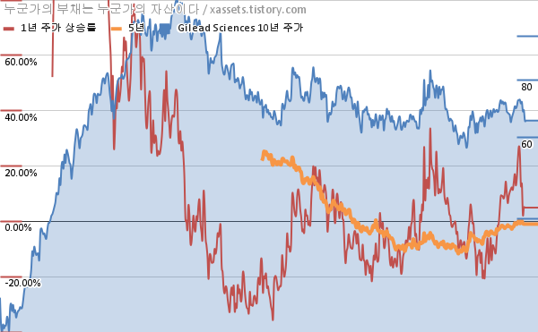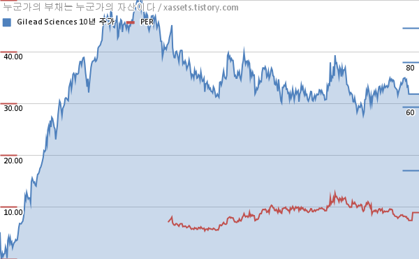 - 포스팅일 기준, 길리어드 사이언스의 1, 3, 5, 10년 연평균 주가상승률은 4.97%, -0.57%, -0.98%, 9.86%이다.